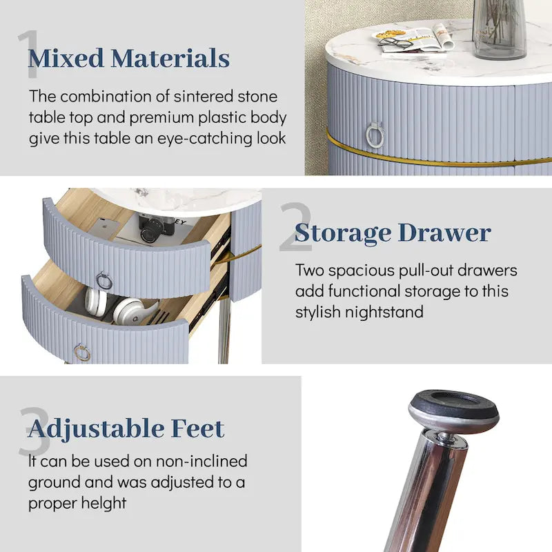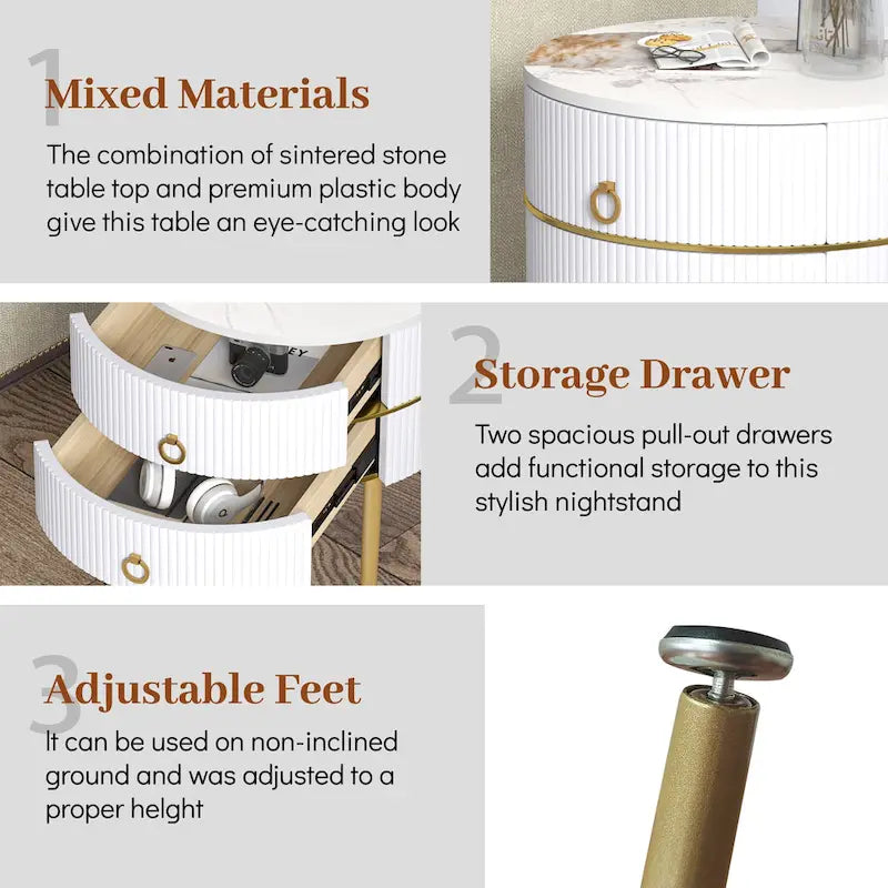 Alliant style moderne et fonctionnalité, cette table d'appoint à deux tiroirs de rangement est un ajout aussi esthétique que pratique à votre décoration intérieure. On apprécie le mélange de matériaux de cette table ronde qui apporte une touche d'harmonie à votre salon. Ses quatre pieds fuselés en acier inoxydable peint soutiennent une table basse en forme de tonneau, fabriquée en plastique de haute qualité. Le plateau, en pierre frittée à la texture naturelle, met en valeur la beauté de sa structure tout en étant résistant aux rayures et aux taches. Outre son plateau spacieux, elle dispose également de deux grands tiroirs offrant un espace de rangement supplémentaire, à l'abri de la poussière, pour vos objets du quotidien, contribuant ainsi à une pièce ordonnée et facile d'accès. Avec ses lignes épurées et sa finition soignée, cette table de chevet deviendra un élément incontournable de votre décoration et s'accordera parfaitement avec la plupart des meubles.